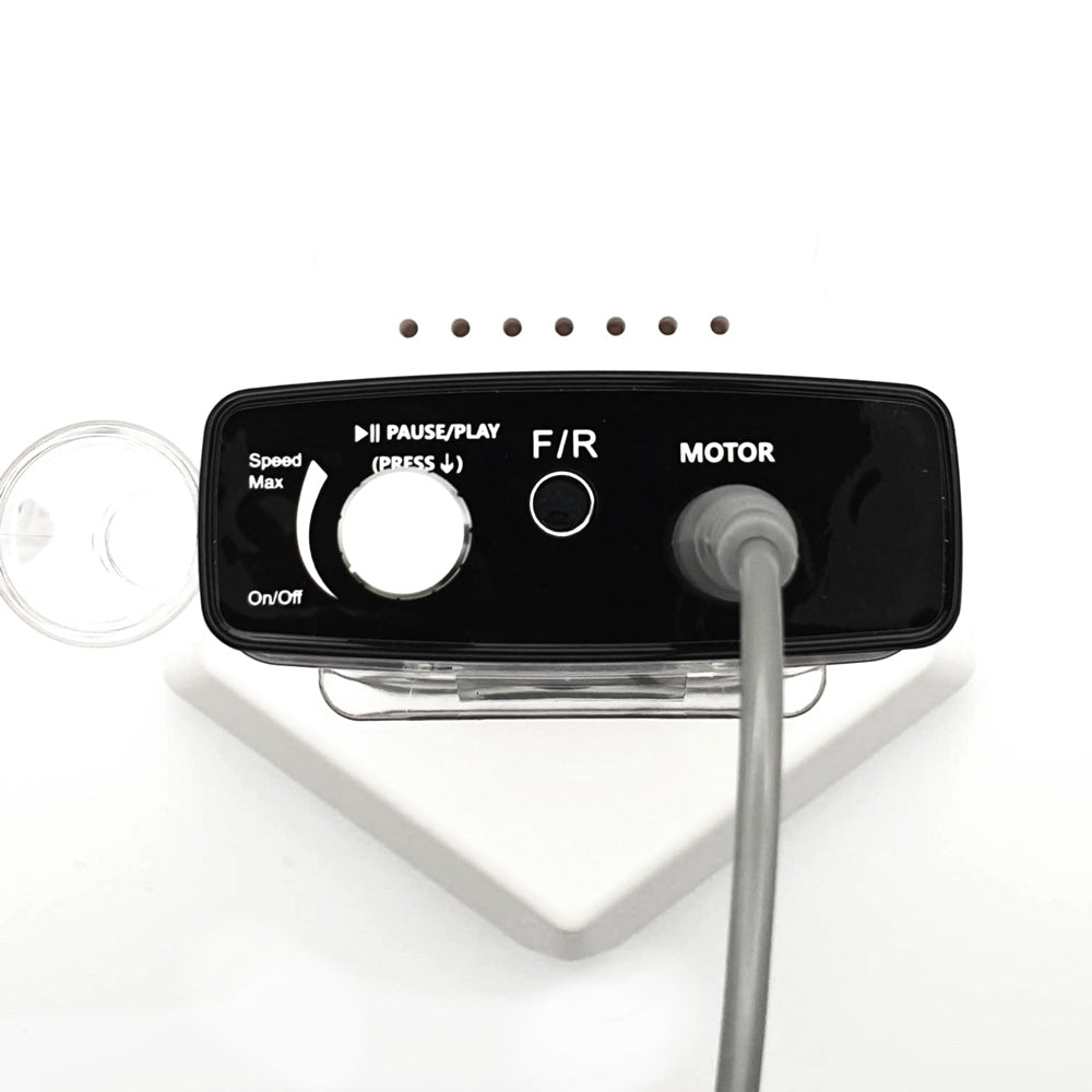 The handpiece, which weighs 165 grams, is made of hardened stainless steel and aluminum. Its slim, ergonomic shape means it fits very well in the hand. The quick-release fastener allows the attachments to be changed quickly and easily. The handpiece works almost vibration-free because it is equipped with a very powerful and durable carbon brush motor. This means that the handpiece runs smoothly and is gentle on the wrists.