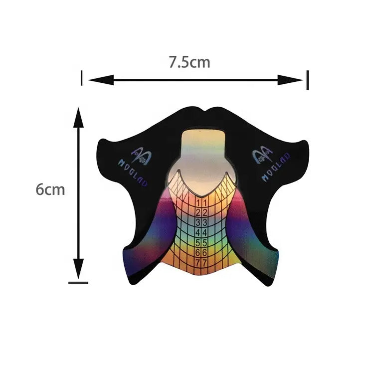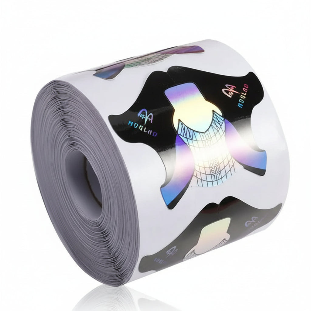 Die Nagelschablonenrolle ist selbstklebend und eignet sich sehr gut für Deine Modellage. So erhält man eine Verlängerung ohne Tips. Mit den 7 verschiedenen Längen als Schablone kannst Du die gewünschte Länge modellieren, so dass alle 10 Finger die gleiche Länge haben. Durch das Doppelflügelsystem bist Du flexibel und kannst Dich jeder Größe anpassen. Die Formstabilität ermöglicht eine optimale Tunnelgestaltung. Die Schablonen sind selbstklebend und zu 300 Stück auf einer Rolle erhältlich.